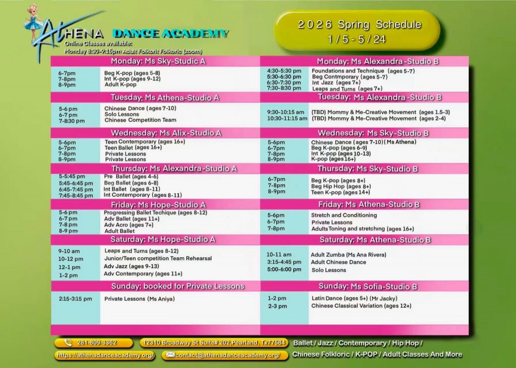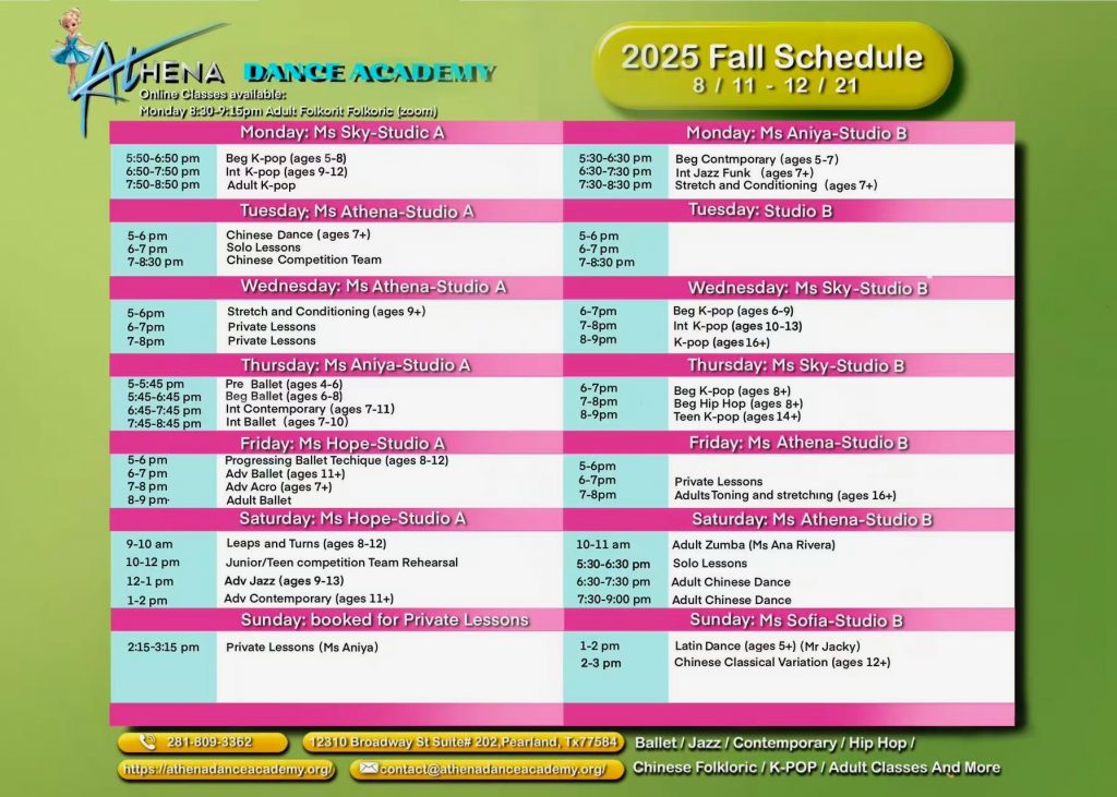 We offer all dances classes for all ages! Pre-ballet, ballet, Jazz, contemporary, tap, Hip Hop, Kpop, Pre-pointe, Technique, Adult classes and more!